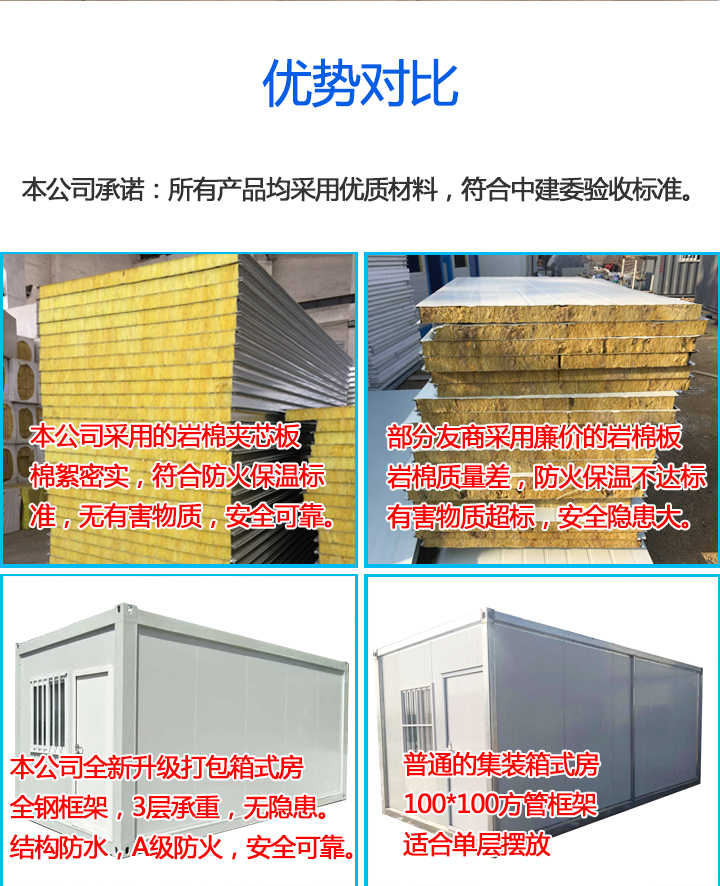 打(da)包(bao)(bao)箱(xiang)房定制(zhi)鋼(gang)結(jie)構框(kuang)架,打(da)包(bao)(bao)箱(xiang)房整體重量輕、強度高、整體剛性好(hao)(hao)、抗(kang)變形能(neng)力強、建(jian)筑物自重僅(jin)是磚混結(jie)構的五(wu)分之一(yi),可抵抗(kang)10級颶風(feng),所以抗(kang)震性和抗(kang)風(feng)性都(dou)比(bi)較好(hao)(hao)。